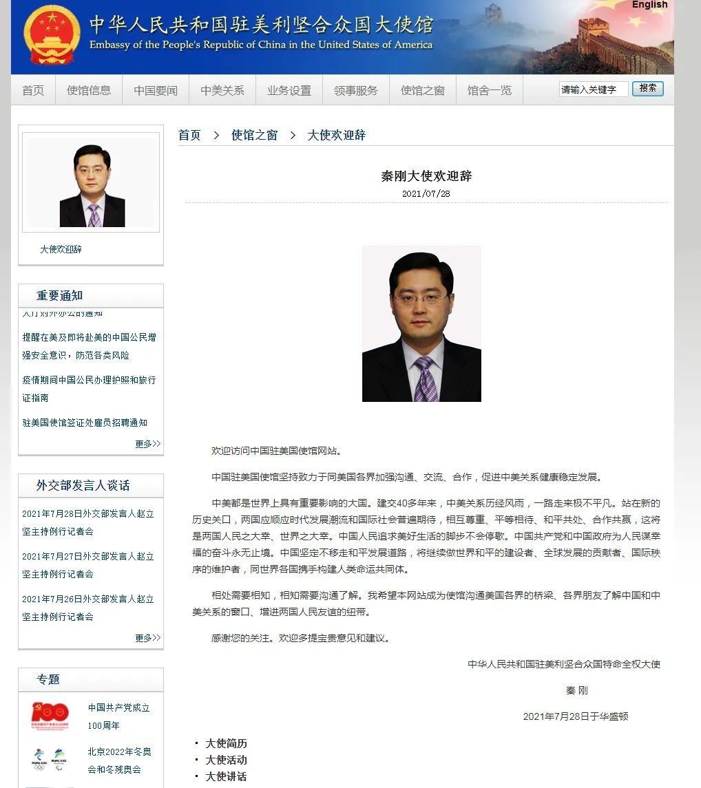 Jun 22, 2021 · 中共駐美國大使館網站6月22日消息,中共駐美國大使崔天凱發表辭別信。 崔天凱在公開信中說,自2013年4月擔任中共 駐美大使 ,在美國工作已8年 秦剛. Jun 23, 2021 · 言行相對溫和的中國駐美大使崔天凱即將卸任,先前傳出接任者是用詞尖銳著稱的中國外交部副部長秦剛。專家認為,若真是秦剛接任,華府外交圈.
